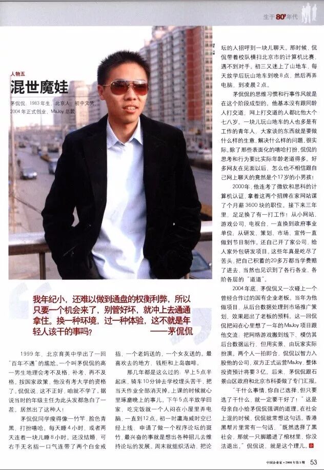 茅侃侃的思维习惯和行事作风就是在这个阶段成型的。他基本没有跟同龄人打交道,网上打交道的人都比他大个七八岁。一块儿玩山地车的人也多是有工作的青年人,大家谈的东西就是要做什么样的生意,解决什么样的问题,很实际。除了那些表面化的嘻哈打扮,侃侃的思考和行为要比实际年龄老道得多。好多网友在见面以后,怎么也不相信跟自己网上聊天的竟然是个17岁的小男孩!