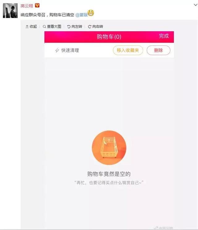 高云翔后一步就麻利地把购物车清空了。网友们看后直呼:双十一可是光棍节,你们这样虐狗真的好吗?