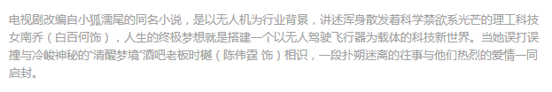 因为它不是常见的狗血言情剧,而是围绕无人机展开的都市科技剧。