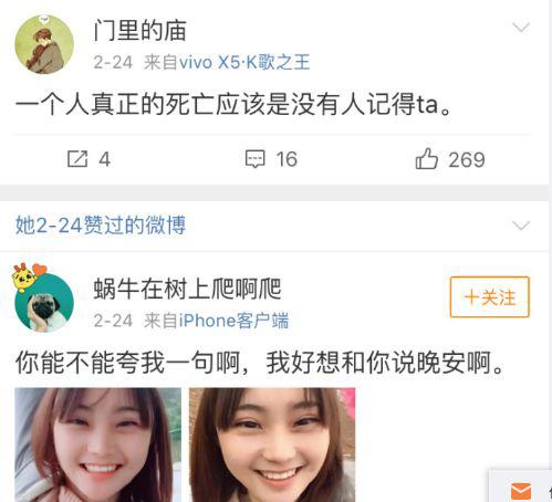 牙姐“去世”后,大家发现牙姐和这个妹子渊源颇深,还点赞过这个蜗牛妹的自拍微博。